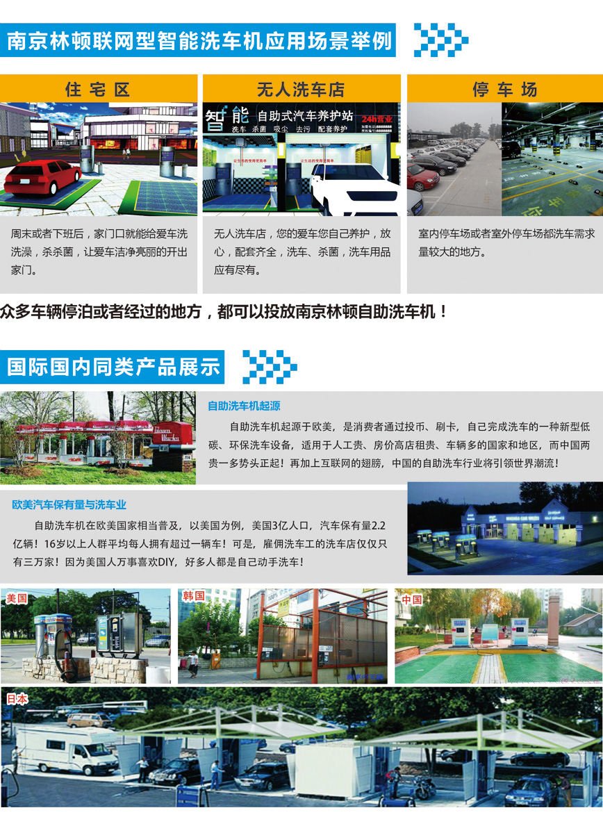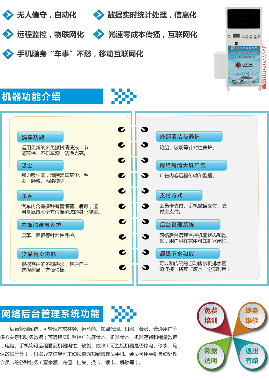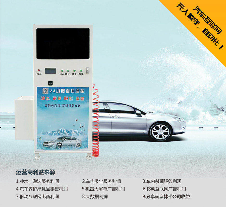 林頓自助洗車(chē)機(jī)無(wú)人值守,自動(dòng)化; 數(shù)據(jù)實(shí)時(shí)統(tǒng)計(jì)處理,信息化; 遠(yuǎn)程監(jiān)控,物聯(lián)網(wǎng)化; 光速零成本傳播,互聯(lián)網(wǎng)化; 手機(jī)隨時(shí)“車(chē)事”不愁,移動(dòng)互聯(lián)網(wǎng)化;